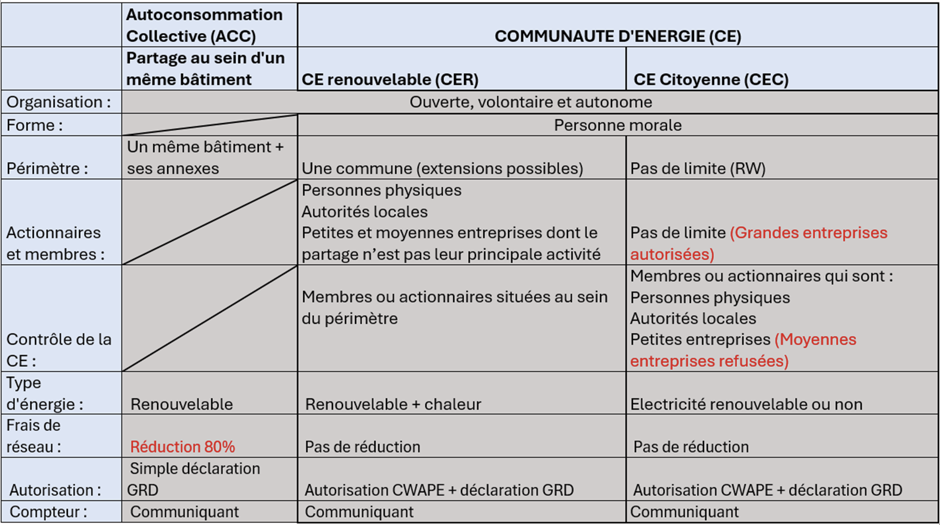 - Le partage au sein d’une communauté d’énergie citoyenne (CEC) sans limite géographique mais dont la gestion ne peut être exercée que par des personnes physiques, des autorités locales et/ou des petites entreprises.