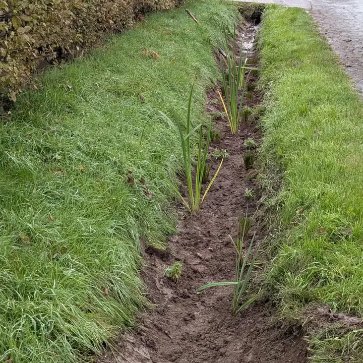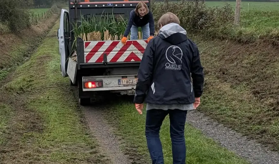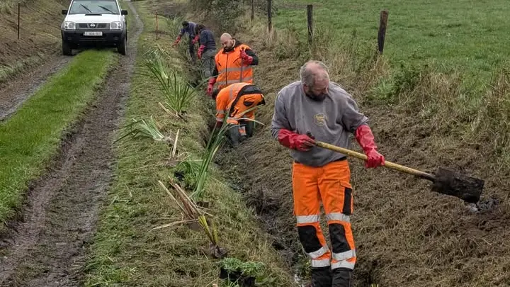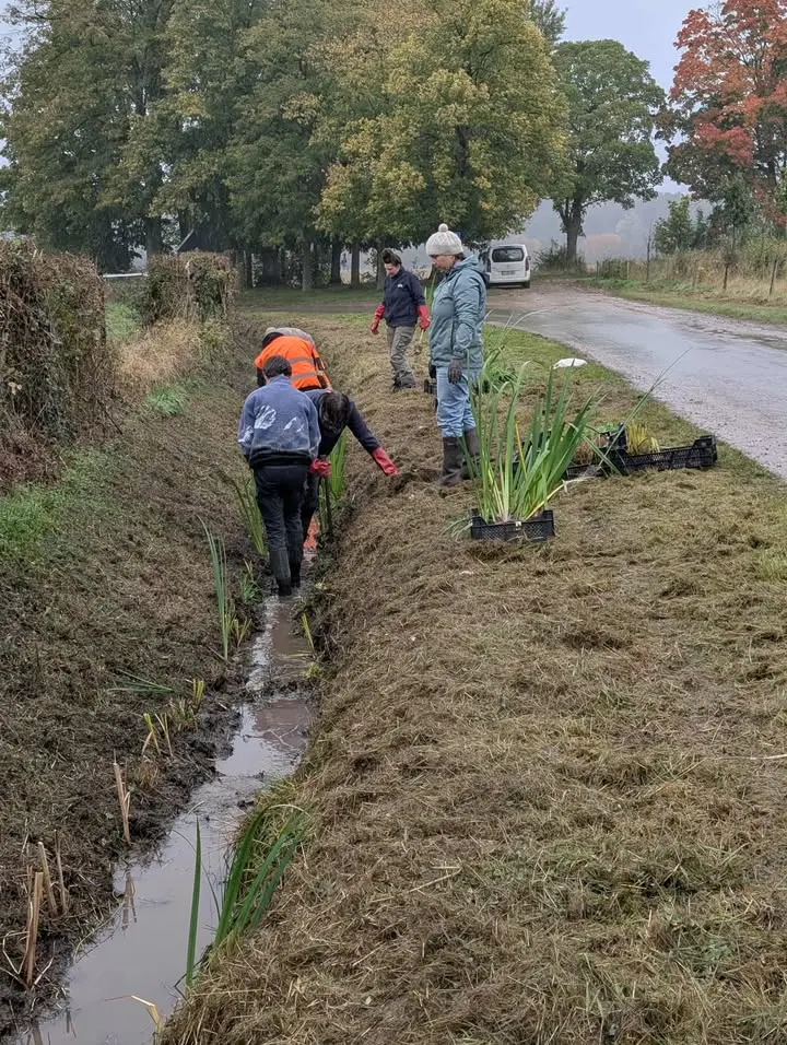 Armés de leur bêche et d’un sourire enthousiaste, toutes et tous ont contribué à la mise en œuvre de ce projet local dont le but est de donner un petit coup de pouce à l’assainissement des fossés recevant des eaux usées. Grâce à une équipe motivée, 879 plantes hélophytes filtrantes ont été plantées en une seule matinée, réparties sur 316 mètres de fossés situés à My et Xhoris. Ce moment de collaboration a permis de renforcer les liens entre les acteurs du territoire tout en agissant concrètement pour soutenir la qualité des eaux et le maillage écologique.