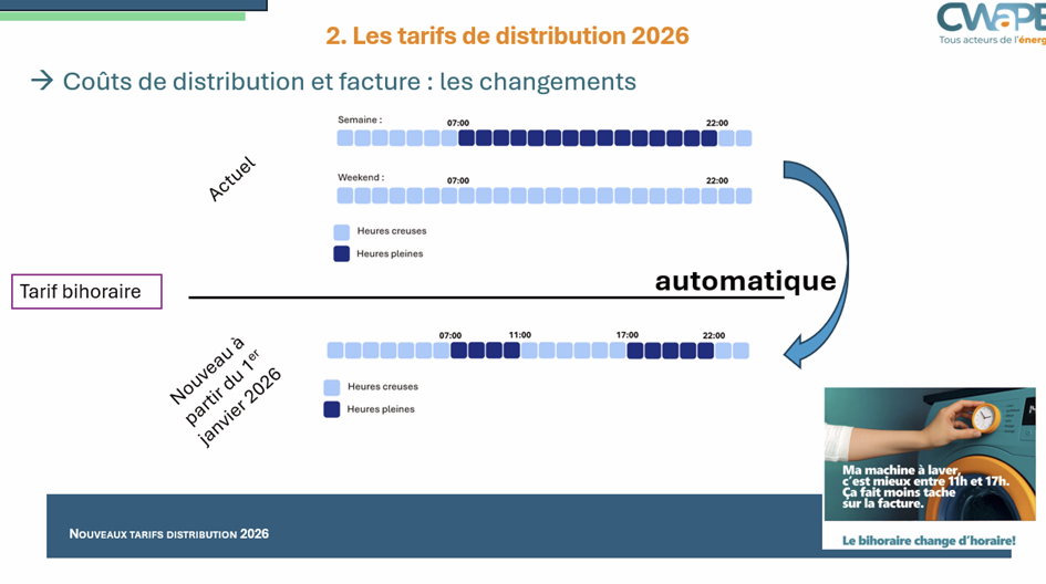 À partir du 1er janvier 2026, les horaires et les tarifs de distribution évoluent, un nouveau tarif de distribution appelé "tarif impact" fera également son apparition en Wallonie. Cette nouveauté, une première en Belgique, vise à mieux équilibrer le réseau électrique en incitant à déplacer certaines consommations en dehors des heures de pointe.