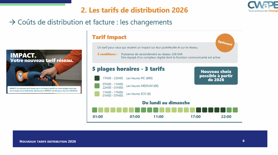 - En option et uniquement à la demande une nouvelle formule de comptage en régime R1 fait son apparition : le tarif impact proposé par les GRD pour le tarif de distribution (hors frais fixe) : Il divise la journée en cinq plages horaires avec trois niveaux de prix différents (Eco, Medium, Pic). L'objectif est d’inciter financièrement ceux qui évitent de consommer aux moments où le réseau est le plus sollicité (comme le pic du soir entre 18h et 22h). Le tarif impact est une démarche volontaire. C'est à vous d'en faire la demande auprès de votre fournisseur d'énergie, qui est votre interlocuteur unique pour souscrire à ce mode de comptage. Ce mécanisme est une nouveauté qui n'existe pas en Flandre ni à Bruxelles.