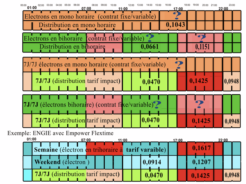 A cela s'ajoute le tarif dynamique pour l’électron (avec pour la distribution le tarif mono, bihoraire, impact)