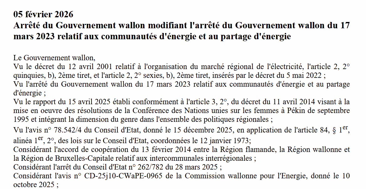 Ce 26 février 2026 est entrée en vigueur une nouvelle définition des "autorités locales". Celle-ci faisait défaut depuis l'annulation par le Conseil d'état de l'article 4 de AGW du 17 mars 2023 relatif aux communautés d'énergie et au partage d'énergie ( arrêt du 28 mars 2025).