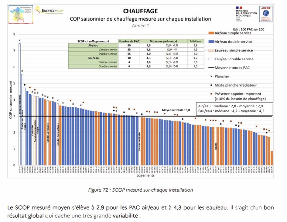 De manière générale, les SCOP théoriques donnés par les installateurs sont souvent surévalués. L'étude ADAME indique que les 3,6 annoncés montre plutôt un SCOP de 3 mesurés. Les modèles double-service (chauffage + eau chaude) sont généralement plus performants que les simple-service.