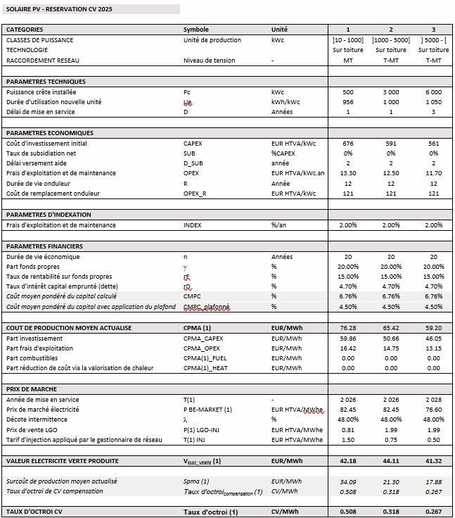 Octroi de certificats verts pour une durée de 10 ans. Depuis le 1/06/2024, c'est le nouveau régime CPMA qui est d'application taux. Ce dernier tient compte du prix de vente de l'énergie, de la décote pour intermittence et du coûts des installations avec une révision annuelle des paramètres de référence. La région wallonne a réexaminé en mai 2024 ses enveloppes de certificats verts additionnels par an et par filière susceptible de réservation, la filière éolienne voient son enveloppe quadrupler et le photovoltaïque plus que doubler pour l’année 2024, mais les valeurs ont diminués pour les années suivantes (décroissance du taux octroi). https://energie.wallonie.be/fr/regime-cpma.html?IDC=10369 . Le projet d’arrêté ministériel CPMA reprenant les valeurs de références applicables jusqu’en 2025 est passé et a été validé par le Gouvernement wallon avant les vacances. Mais Il n’est pas encore publié officiellement, voici les données provisoires du 28/07/2025 pour la filière photovoltaïque (pour plus d'info n'hésitez pas à nous contacter).