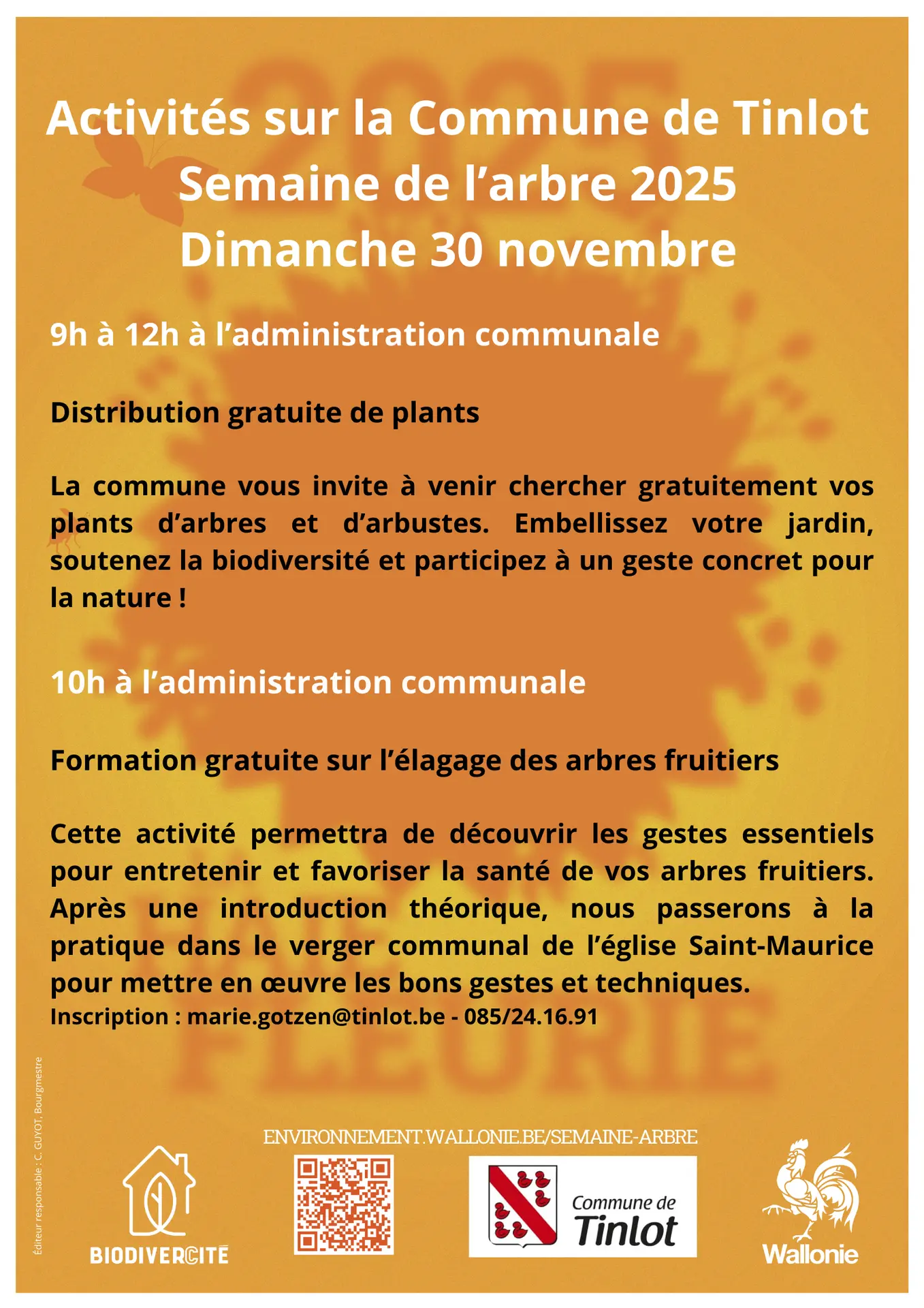 - Tinlot : 30/11 à 10h formation gratuite à l’élagage des arbres fruitiers – Administration commuale de Tinlot - inscription 085 24 16 91 marie.gotzen@tinlot.be