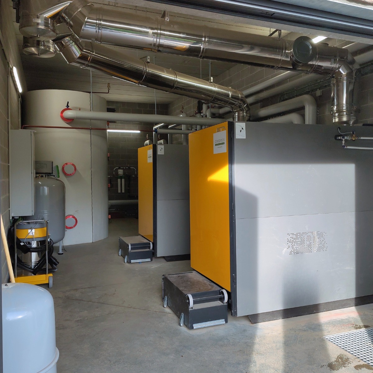 La chaufferie bois, équipée de deux chaudières de 240 kW, est installée dans un bâtiment spécialement construit pour le projet. Le bois est stocké dans un silo de 160 m³, attenant au local de la chaufferie.