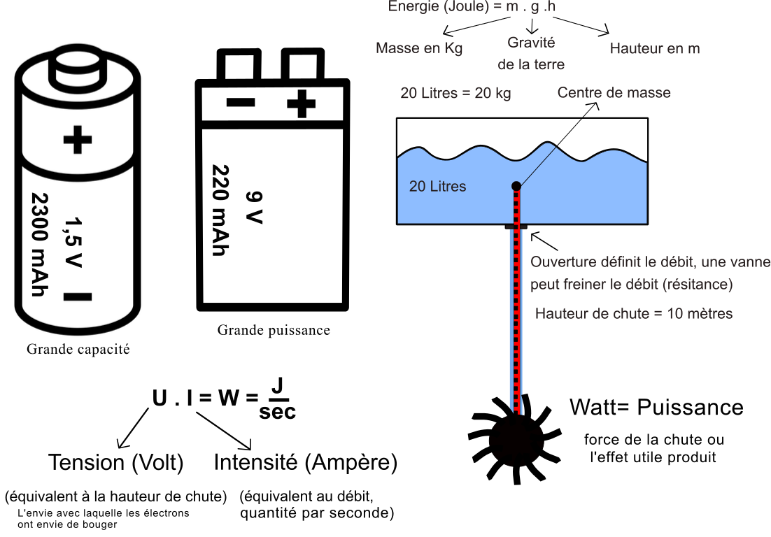 La différence de charges entre les deux pôles de notre pile crée une "pression électrique" ou l’envie de ce transfert (la tension) comme de l'eau en haut d'un barrage. On l'appelle la tension. La LED prouve que le transfert a réellement lieu et qu'il est assez puissant pour faire un travail utile (produire de la lumière), comme la turbine dans un barrage hydroélectrique. (Analogie avec un barrage et une hauteur de chute)